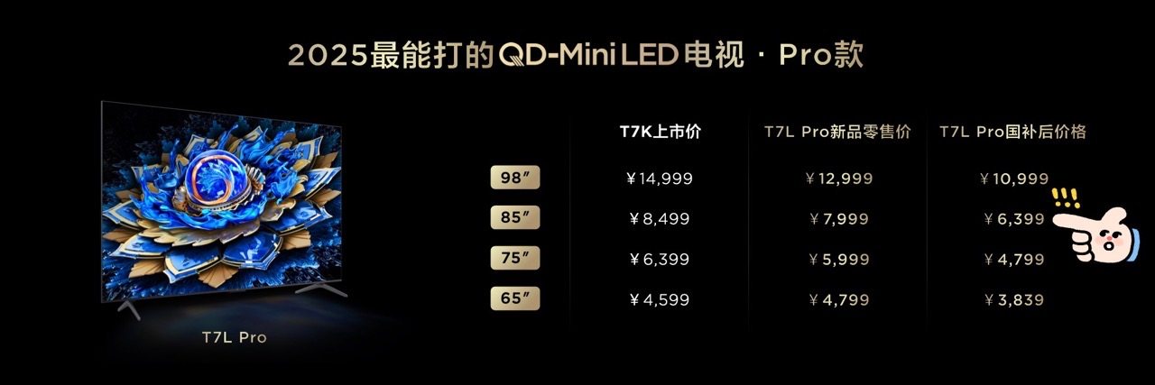 而在进行了十大维度升级的基础上,今年新品的价格还做到了“加量不加价”,部分机型还甚至还给出了减价的惊喜,比方说:去年85英寸的T7K上新价格为8499元,而今年全新升级的同尺寸的T7L Pro上新价仅为7999元,甚至叠加国补后只需6399元即可入手,质价比直接上升了一个台阶!