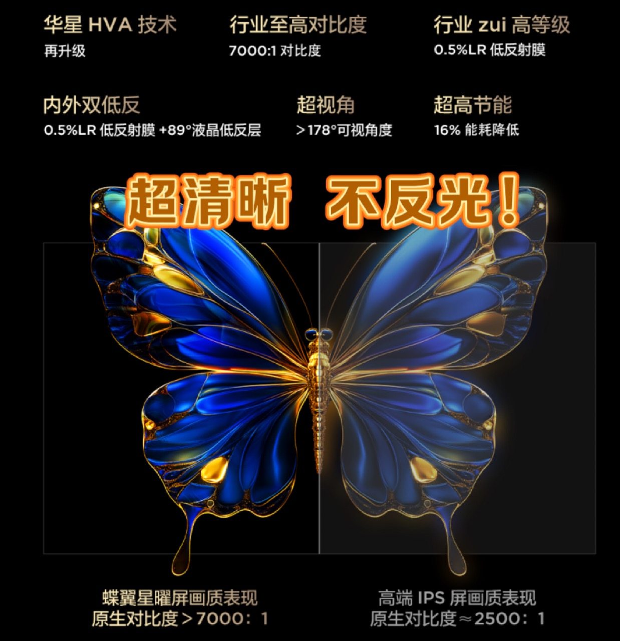 对比度作为衡量画质的灵魂标尺,传统液晶电视受限于背光均匀性而陷入画面模糊的桎梏,Mini LED的出现则是为解决这一问题而生的,因此,对比度的突破一直是各大厂商追逐的核心标地,而一块高对比度的屏幕尤为重要,缺少这个因素,再好的Mini LED技术都白搭。TCL仿佛早就深知“核心技术必须掌握在自己手中”的硬道理,因此,作为全球唯一拥有自身屏厂的家电巨头,优势不言而喻。去年搭载的广角超显屏,今年直接升级成了蝶翼星曜屏,作为华星HVA旗舰屏,对比度从去年的5000:1推升至了惊人的7000:1,是普通IPS屏的5倍,亮暗场均清晰可见。