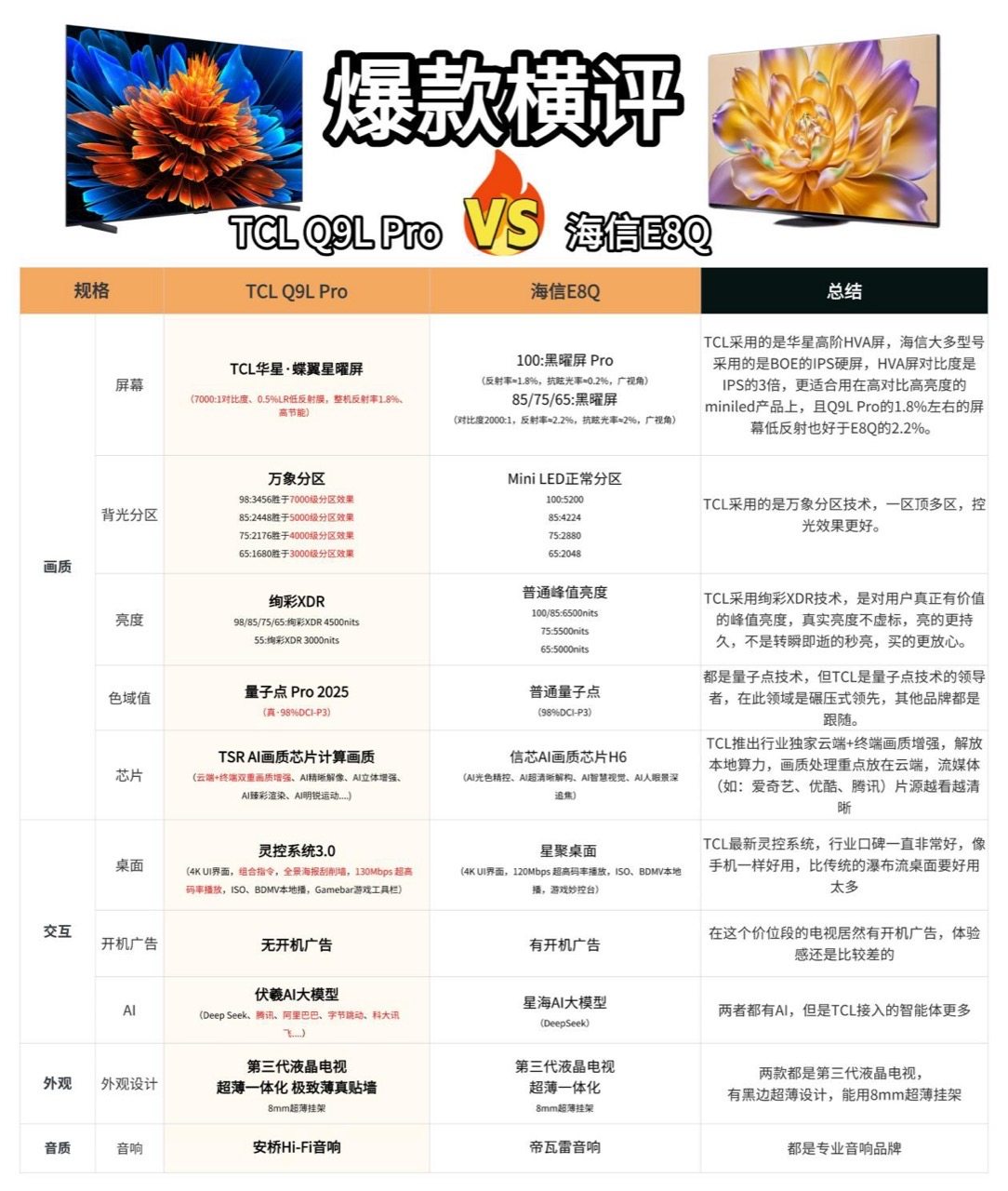 此外,T7L系列和Q9L系列新品还对音响、外观、画质芯片、操控系统等十大维度进行了升级,即便是对比类似价位的热门款电视,谁更值得买一眼便知。