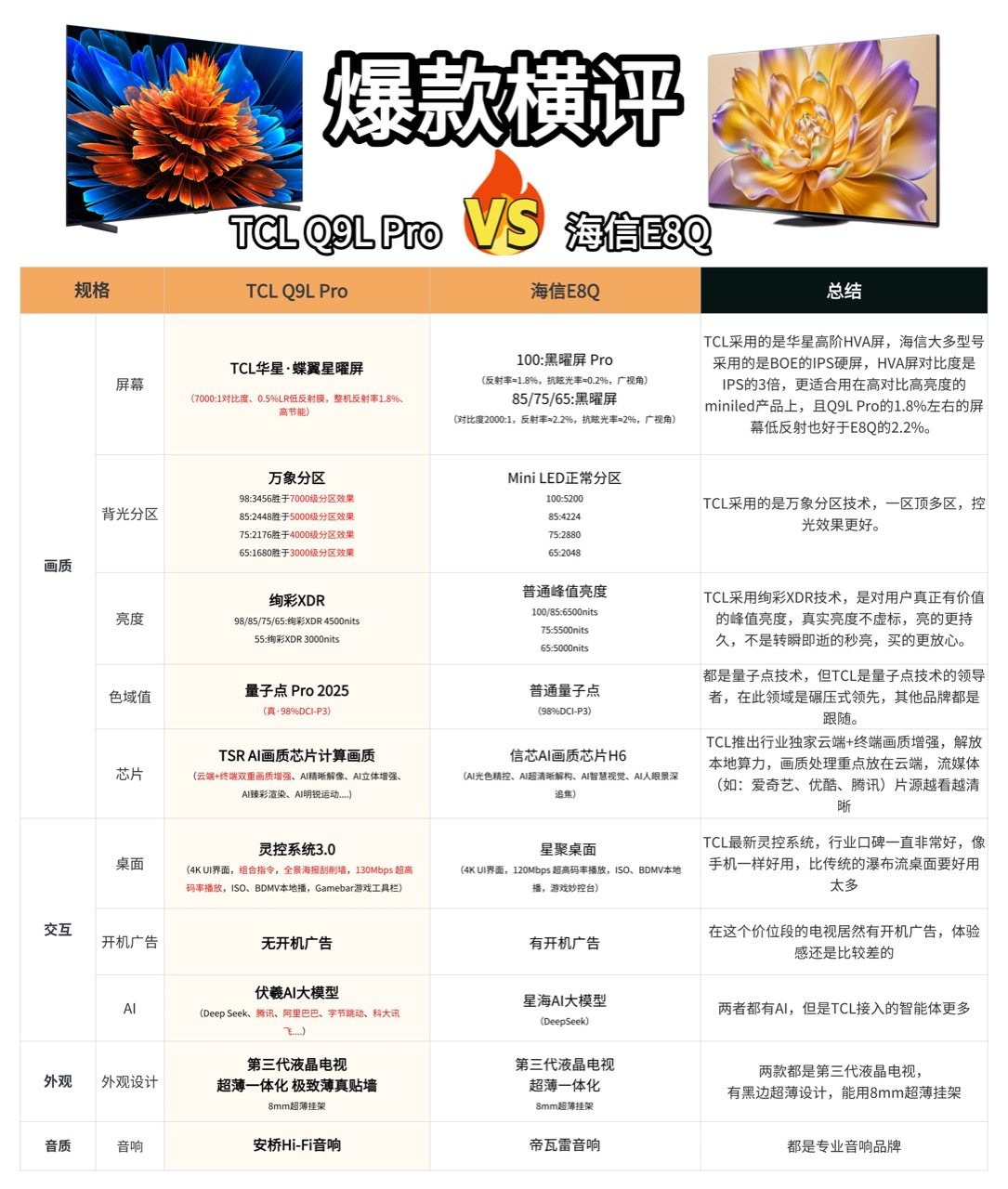 以T7L Pro系列和Q9L Pro系列为例,屏幕升级为蝶翼星曜屏,是华星HVA旗舰屏,原生对比度提升至7000:1。画面细节清晰丰富、色彩艳丽。反观当下,多数品牌受技术制约,仍用对比度仅1200:1的普通IPS硬屏,与TCL新品相比,屏幕对比度相差5倍有余,画质自然也毫无优势。