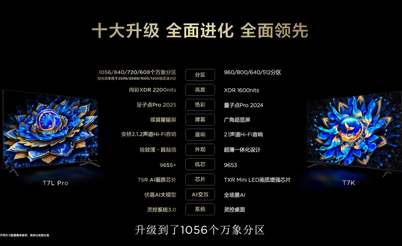 当然,要发挥一块高端屏幕的优势让画质更极致,还得看控光分区技术!关注电视圈的朋友知道,现在高分区电视越来越多,但因为边际递减效应,如今分区数量增加更多对画质提升也帮助不大!不过凡事有例外,比如能实现“一区顶多区”的万象分区技术!这次新品从之前的普通Mini LED分区升级成了万象分区,控光实力大幅提升。这项技术能摆脱边际递减效应的魔咒,核心在于TCL是从底层技术出发,深入从背光到成像的7大环节进行升级,从而让万象分区的控光效果可以比普通分区强数倍。举一个例子,比如T7L Pro搭载了1056个万象分区,实际超越了2500级普通分区的控光效果,而画质效果更是翻倍提升!