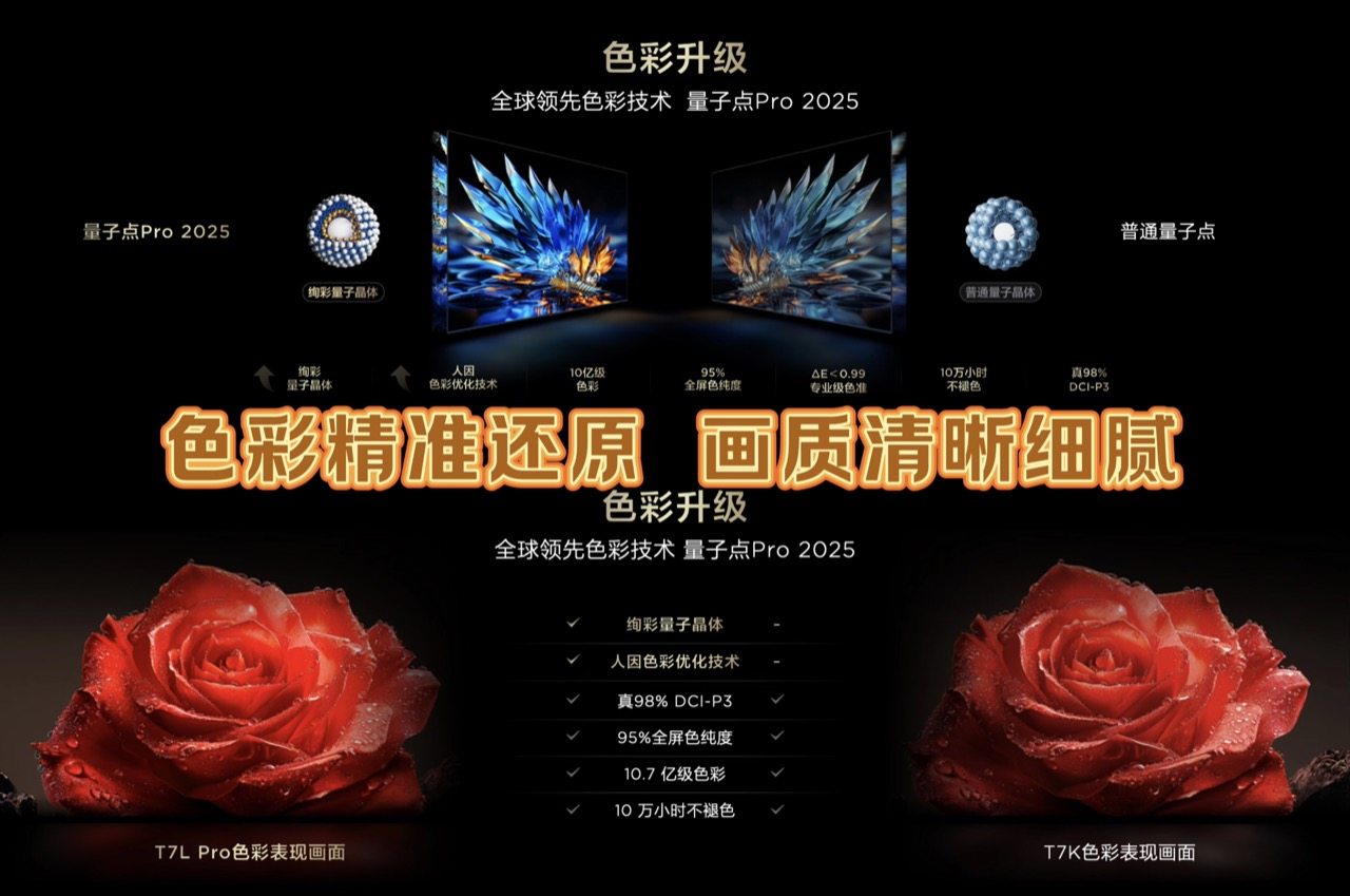 除了画质的跨越式提升,在色彩和亮度上方面也实现了质的飞跃。T7L和Q9L系列由原来的量子点Pro 2024升级为最新的量子点Pro 2025,实现了真·98%DCI-P3超高色域、色准ΔE<0.99,做到10万小时不褪。同时,量子点Pro 2025还配上了人因色彩优化技术,能够根据人眼感知调整画面,让显示画面更还原真实世界的场景,真正实现十亿原色屏,十年好色彩。
