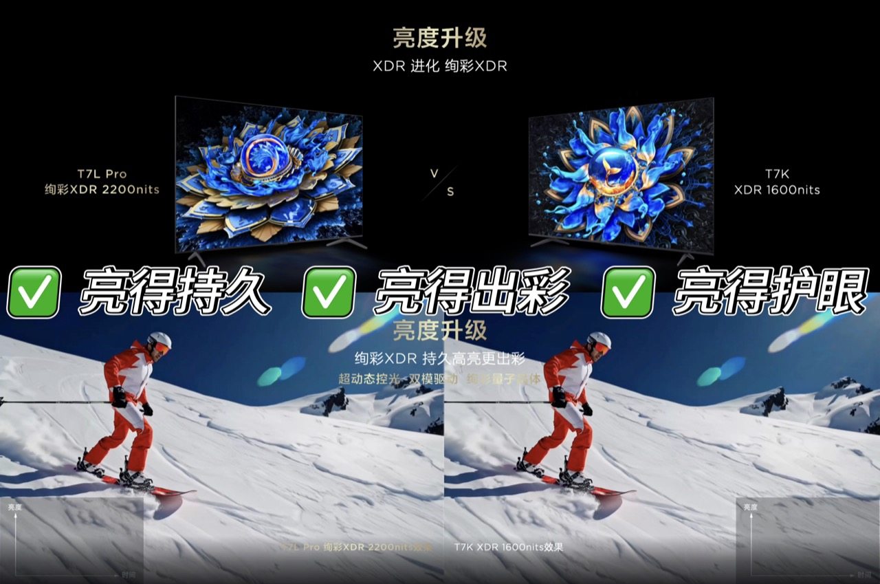 另外,TCL T7L Pro系列将XDR 1600nits升级为绚彩XDR 2200nits;Q9L Pro从XDR 2400nits升级为绚彩XDR 4500nits,不仅彩色画面的峰值亮度更高,而且能将峰值亮度持续时间延长数倍,更好地显示出真实世界的亮度效果。
