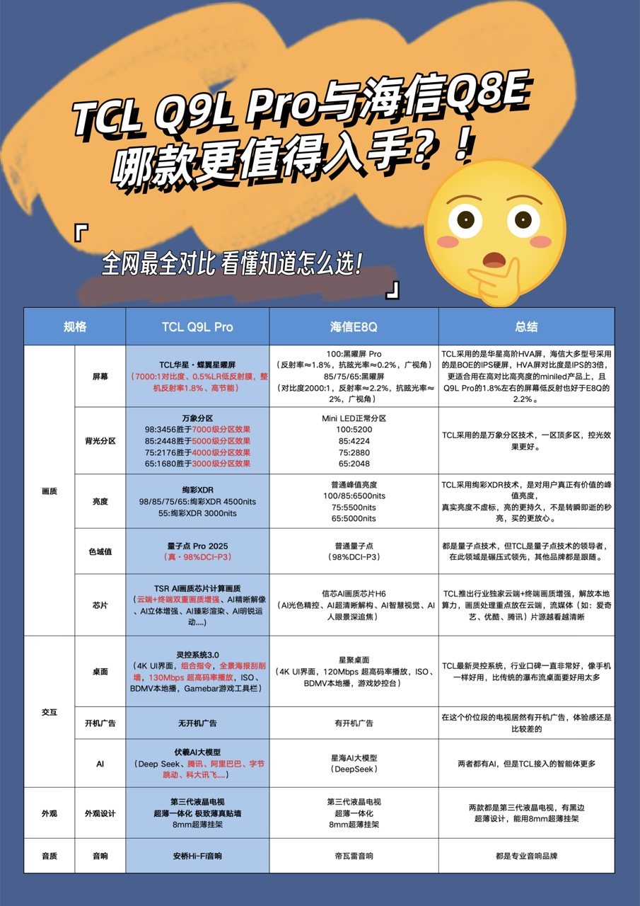 总的来说,T7L和Q9L系列其强大的性能、丰富的配置和亲民的价格,是大家选购Mini LED电视的不二之选。尤其是Q9L Pro系列对比同级别的产品,比如说海信E8Q旗舰版,实力也是杠杠的。比如,Q9L Pro搭载的蝶翼星曜屏(对比度7000:1、反射率1.8%)在对比海信E8Q的黑曜屏(对比度2000:1、反射率2.1%)时,显示效果明显优胜;还有操控上,Q9L Pro搭载的灵控系统3.0功能更加全面、可玩性也能强,具体大家可以看下详细对比图。所以啊,想买Mini LED电视的朋友们趁着国补赶快上车吧,早买早享受~