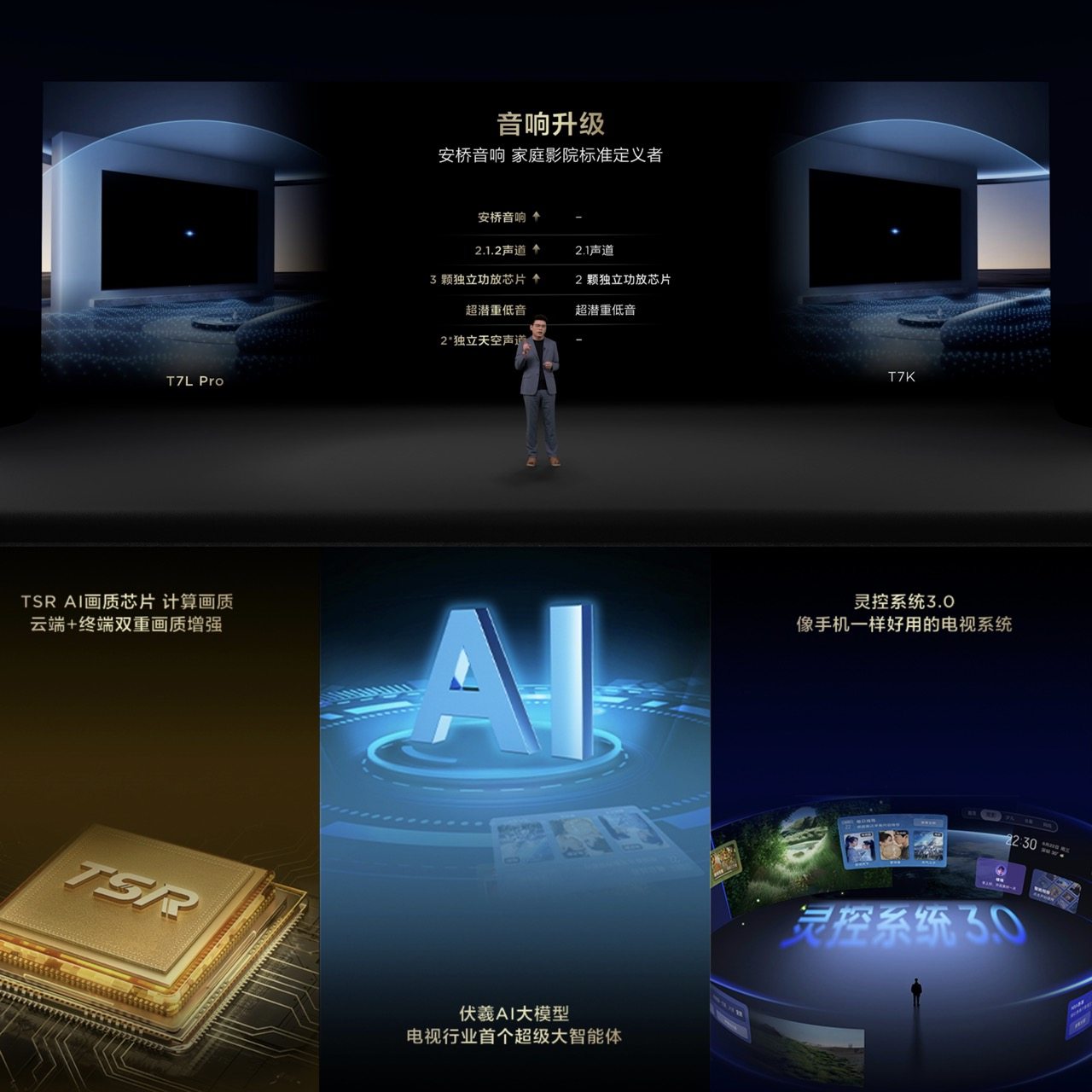 除了上述亮点外,相比上一代产品,T7L系列和Q9L系列还在音响、智能体验、画质芯片以及外观设计等方面也实现了全面升级。音响方面,T7L Pro系列和Q9L Pro系列采用了安桥2.1.2的5声道Hi-Fi级专业音响系统,为用户带来360°全方位、立体式3D环绕音效体验。智能体验上,灵控系统3.0灵动卡片增加至300+,还有定制化场景、分身系统等,可轻松满足全家人的娱乐需求。TSR AI画质芯片的加入,进一步提升了画质效果。外观上,由于采用微距OD,机身厚度比普通Mini LED电视更薄,能更好地融入家居环境。