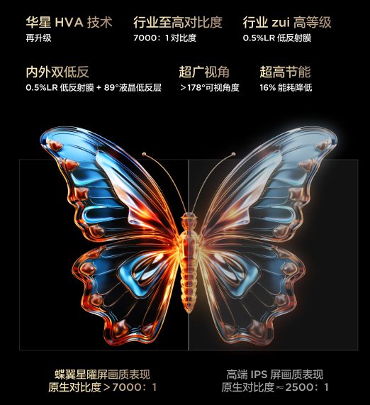 对画质有高要求的可千万不要错过!要知道画质好不好就得看这对比度!而一块高对比度的屏幕就是关键!此次,新品T7L Pro与Q9L Pro系列搭载了顶配VA屏——蝶翼星曜屏,直接让画质实现“脱胎换骨”,通过纳米级仿生液晶分子排列,实现7000:1超高原生对比度,与普通IPS屏相比,让对比度狂飙5倍!再叠加0.5% LR低反膜与89°规则排布的液晶分子,通过内外双低反加持,让整体屏幕反射率低至1.8%,不管在强光下还是任何角度,画面都依旧通透如清晰。这块过去万元机才搭载的顶配屏幕如今却下放至亲民价位,让同级竞品只能瞬间“退赛”!