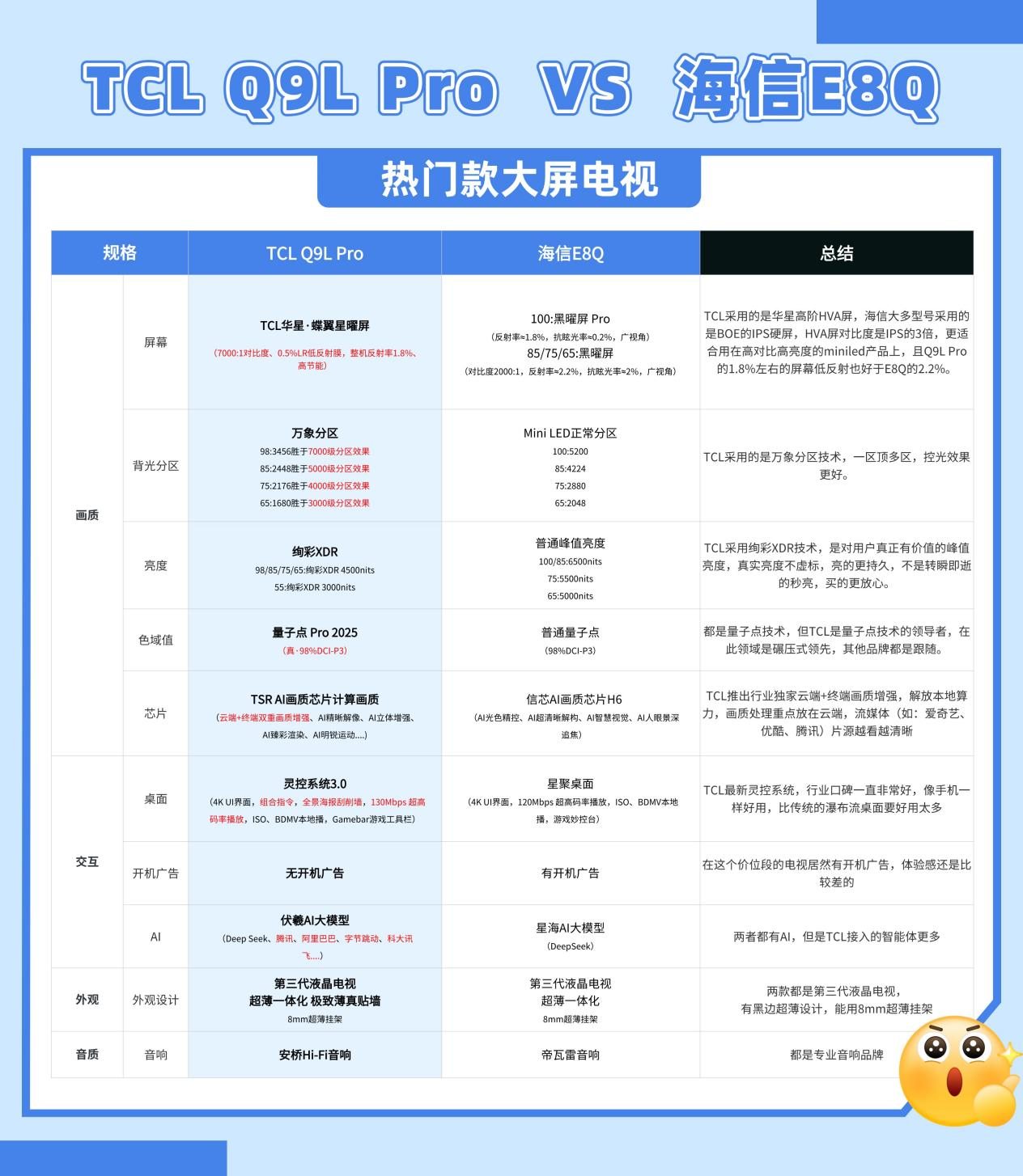 除了在核心画质技术上的突破,此次新品在其他方面共十大维度也进行全面提升。音响系统升级为安桥2.1.2标准的5声道Hi-Fi级专业音响,打造沉浸式环绕声场;灵控系统升级至3.0版本,开机无广告,支持个性化桌面定制,新增的4K壁纸和4K UI,让电视操作界面更加美观、流畅。还有TSR AI画质芯片,基于伏羲AI大模型,对画面进行双重优化。以Q9L Pro为例,相较于类似价位段的其他热门产品而言,也极具优势,消费者一眼便能知如何抉择。