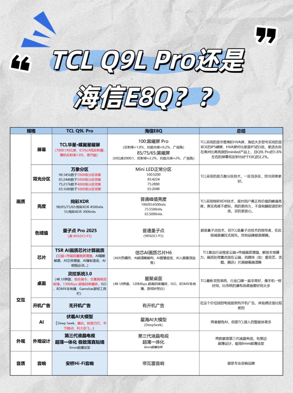 从万象分区到量子点Pro 2025,从蝶翼星曜屏到灵控系统3.0,TCL的T7L和Q9L系列无疑重新定义了主流价位电视的价值。相比上一代产品,这次的升级不仅是技术的迭代,更是用户体验的全面飞跃。尤其是在国家补贴政策的加持下,98英寸T7L Pro国补后仅需10999元,65英寸版本更是低至3839元,与同价位的产品相比,毫无疑问TCL新品的配置是最顶的。(随意拿了一款出来比较,大家看图一目了然)。
