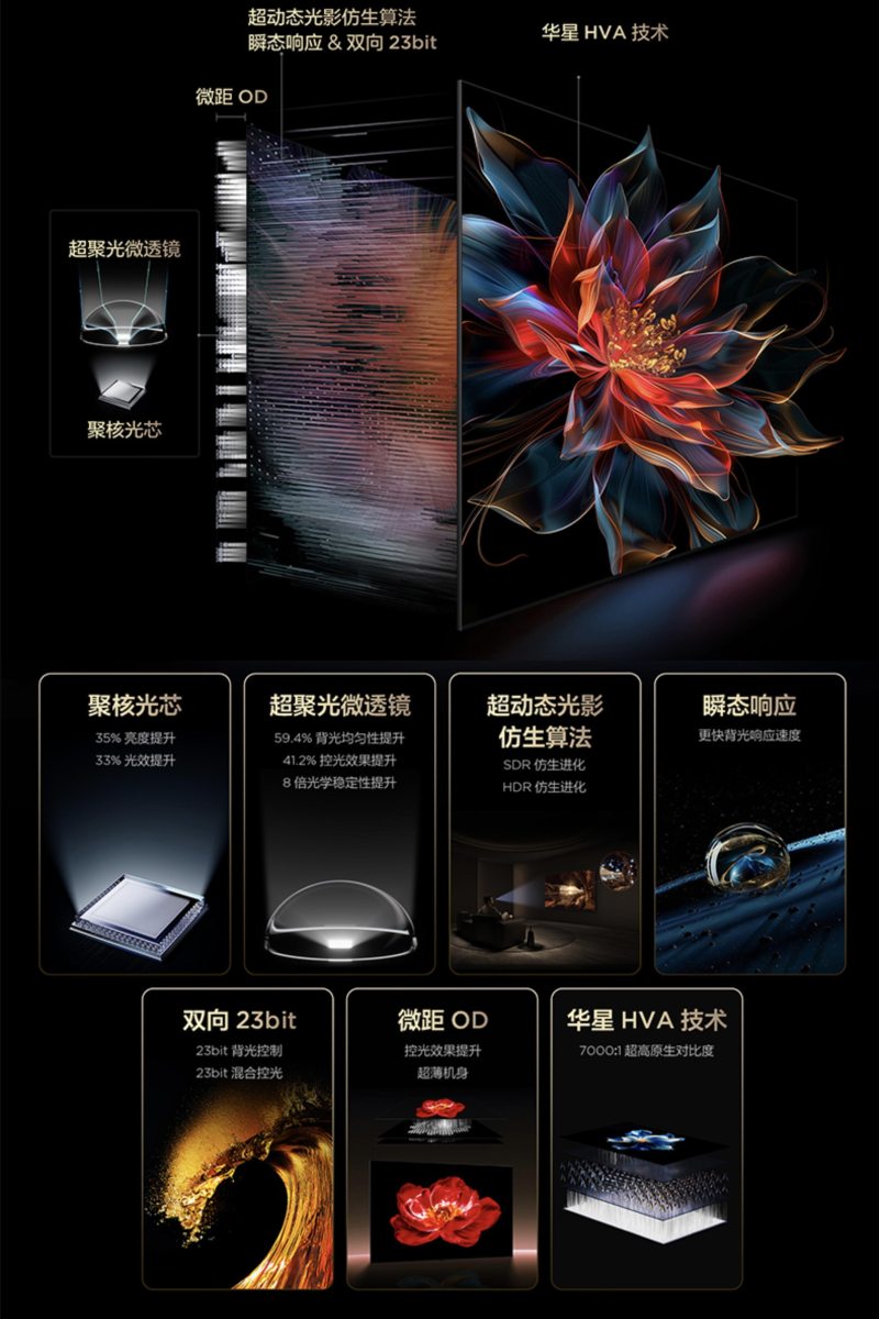 相比普通背光分区达到一定程度就会出现边际递减效应,对画质提升有限的情况。这次T7L系列和Q9L系列应用的万象分区技术,它是一项从背光到成像,通过发光芯片、透镜技术、OD设计、光影控制算法以及屏幕等7大环节底层技术升级的全新的Mini LED控光方案,它不仅解决了电视光晕问题,控光能力更是大幅提升,达成“一区顶多区”的控光效果,让画面细节表现和暗部场景处理有了质的飞跃,呈现出更为细腻、真实的画面效果。T7L系列最高搭载1056个万象分区,画质效果远超2500级背光分区的普通电视。而Q9L系列更是高达3456个万象分区,控光效果远胜行业7000级普通分区的电视。