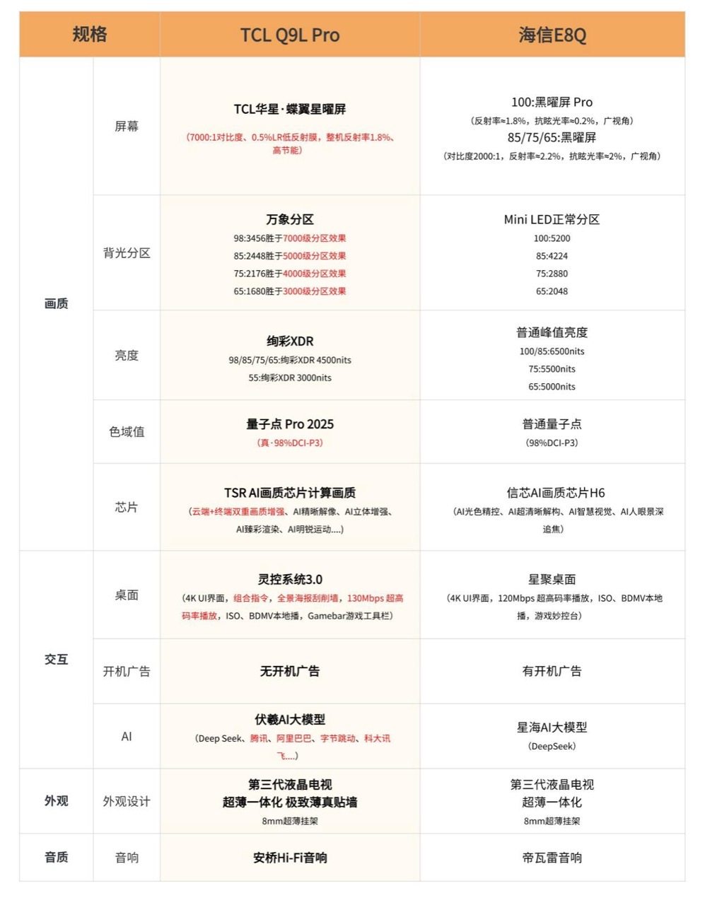 TCL Q9L Pro VS 海信E8Q怎么选?屏幕和分区技术对比差异巨大!
