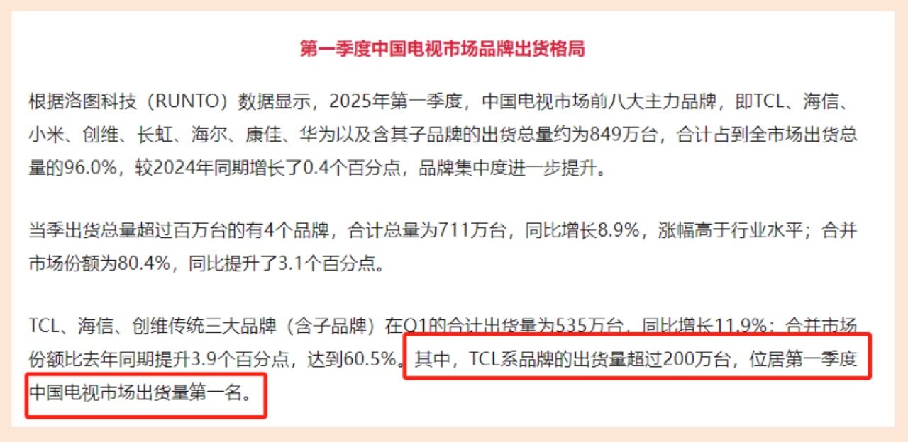 最后,再温馨提醒下各位:国补虽香,但千万别吃了信息差的亏!看准核心选购要点,才能入手价格香、体验好的电视。这次,个人更推荐TCL Q9L Pro这款,从画质、价格等维度上看会更符合大多数人的追求。并且顺便一提,在开头提到的第一季度中国电视市场出货量排名中,TCL系品牌凭借超过200万台的出货量拿下了销冠宝座,大品牌更有保障。那么,评论区说说看,你们更喜欢哪款吧!