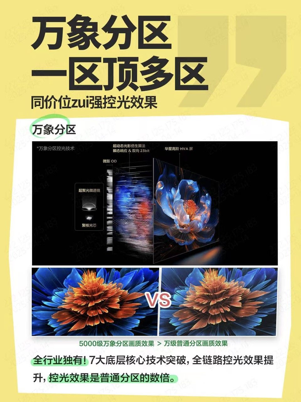 现在有些电视分区堆得多,但一到暗场就翻车,漏光、光晕随时上线。Q9L Pro搭载了一区顶多区的万象分区控光系统,从背光到成像全链路优化升级,万象分区的控光效果是普通的数倍。85吋 Q9L Pro搭载了2448个万象去分区,但实际控光表现远超不少5000分区的产品,关键就在于控得准、稳、干净。