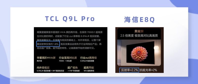 除了对比度,抗反光能力也是屏幕体验里很重要的一环。毕竟我们看电视不只是晚上看,白天拉开窗帘如果反光严重,那体验就打折了。TCL Q9L Pro采用了0.5%LR低反膜,搭配89°规则排布的液晶分子实现了内外双低反,整体屏幕的反射率做到了1.8%,大白天看电视也不用担心太阳光反射,画质依旧清晰透亮。海信E8Q的反射率为2.2%,也达到了比较优秀的水平,日常使用没有问题,只是对光线特别敏感的用户可能会稍有感知。