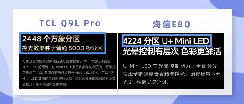 TCL Q9L Pro搭载的万象分区技术,并不是单纯的堆砌分区数量,而是一系统级的Mini LED控光方案,全面升级了从电视背光到显示成像的7大环节,实现了一区顶多区的显示效果。比如85吋Q9L Pro搭载了2448个万象分区,但远超普通5000级的控光效果。而海信E8Q采用了4224个普通分区,虽然在数量上占有一定优势,但由于Q9L Pro有底层技术加持,在细节控光方面表现会更加出色。