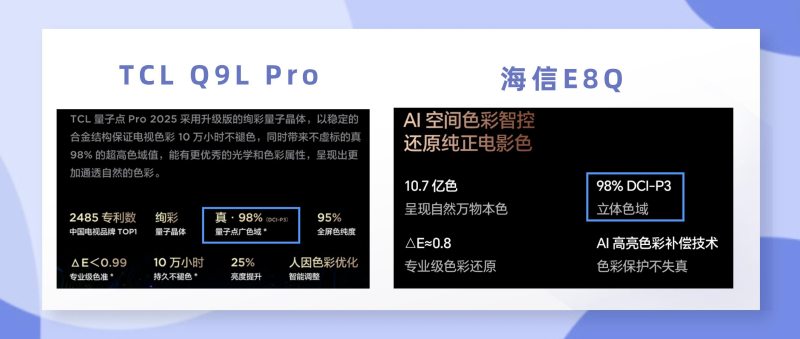 TCL Q9L Pro搭载了量子点Pro 2025技术,实现了98% DCI-P3广色域,色准ΔE<0.99,全屏色纯度达到95%。简单来说,就是颜色该有多艳就多艳,但绝不会过饱和到失真,看大片不会刺眼,刷剧也很养眼。而海信E8Q也使用了量子点技术,色域同样达到了98% DCI-P3,色彩表现力非常不错。两款电视在色彩这块的实力都在线,不过如果实在要二选一,那TCL在量子点领域布局得更早,毕竟他家是首个推出量子点电视的品牌,在技术研发上肯定更占优势。