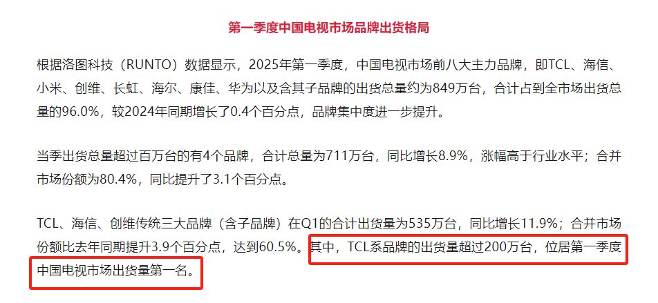 目前,TCL已连续五年蝉联中国Mini LED电视销量冠军,并取得了2024年Mini LED电视全球出货量第一的亮眼成绩,并且从洛图科技(RUNTO)最新发布的数据来看,TCL系品牌出货量凭借超过200万台,位居第一。TCL Q9L Pro的“大获全胜”,只不过再一次印证了“买电视一定要买Mini LED电视,买Mini LED电视只选TCL”的行业共识而已。