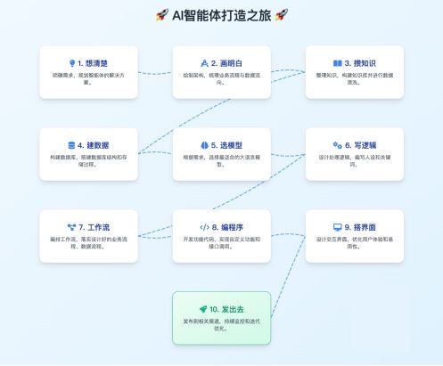 搭建Agent就是把人工写脚本的工作流总结出来,形成各个节点,像搭积木一样,在平台里搭起来。所以只要想好每一块木头负责什么功能,谁在前,谁在后,很快就能搭出来。哪怕你不会编程,什么技术都不懂,也没关系,最多两天全部掌握。