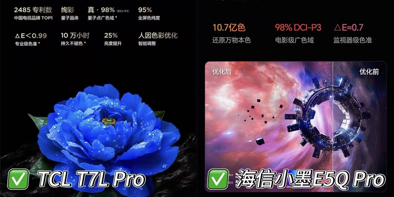 在色域方面,两款电视均标称98% DCI-P3。不同之处在于TCL T7L Pro则采用了更为先进的蓝光量子点Pro 2025技术,实现了真·98% DCI-P3的色域覆盖;相比之下,海信E5Q Pro则没有公布自己所用的方案。蓝光量子点方案不仅提升了整体显示效率、增强了对比度,还具备更高的稳定性和更长的使用寿命,能够长期保持色彩不褪色。
