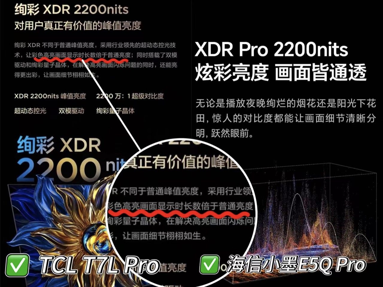 亮度方面,TCL T7L Pro搭载了绚彩XDR技术,峰值亮度可达2200nits,能够真实还原画面中的高光细节,带来更具冲击力的视觉体验。海信E5Q Pro虽然也标注了XDR 2200nits,但在实际表现中,TCL的亮度表现更加真实,且能保持长时间的高亮度输出,进一步提升了观看时的沉浸感。