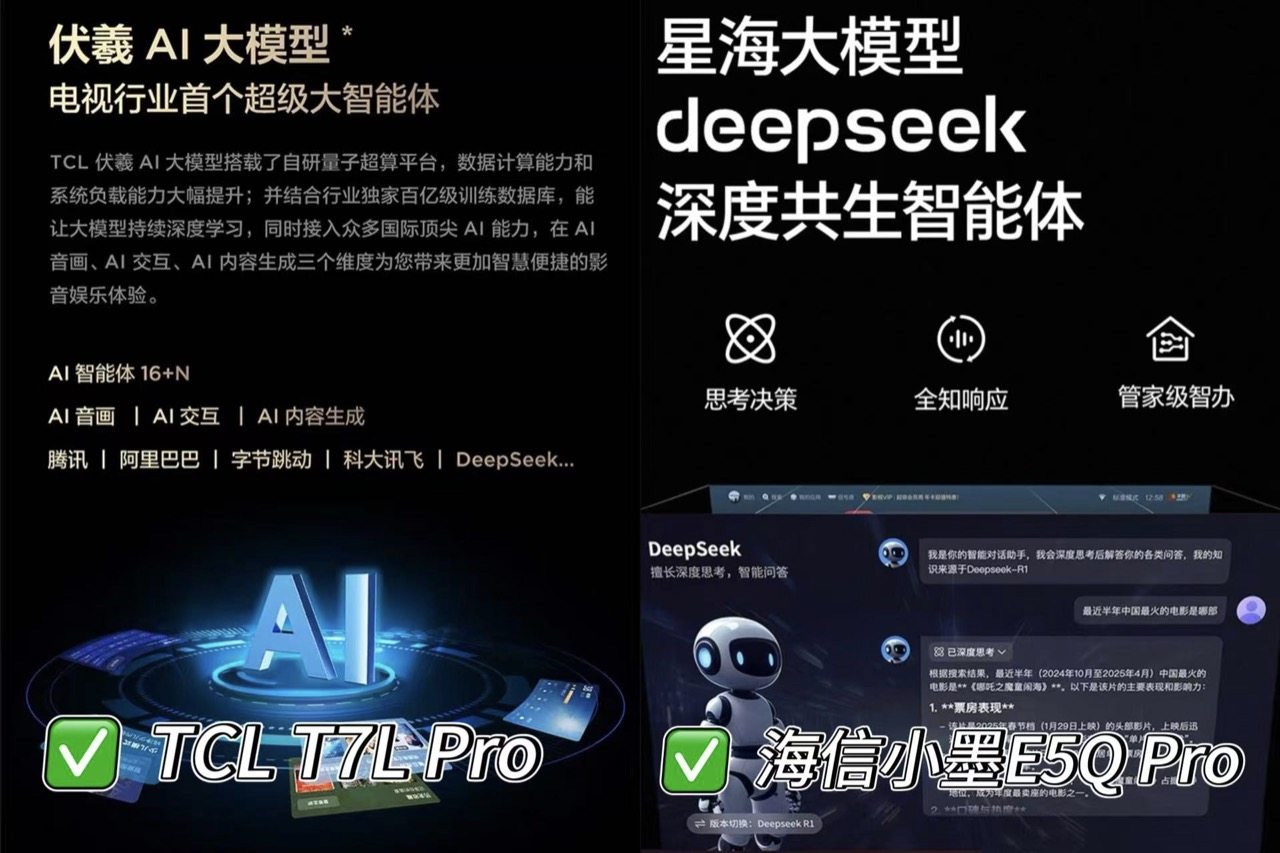 在智能系统方面,海信E5Q Pro采用星海大模型,深度融合DeepSeek,在操作指令的理解上更加全面深入,能够准确执行复杂的命令。TCL T7L Pro则内置了伏羲AI大模型,集成了多达16+N个智能体,覆盖了市面上主流的AI大模型,包括DeepSeek、腾讯、阿里巴巴、字节跳动以及科大讯飞等,几乎囊括了所有你能想到的AI功能。