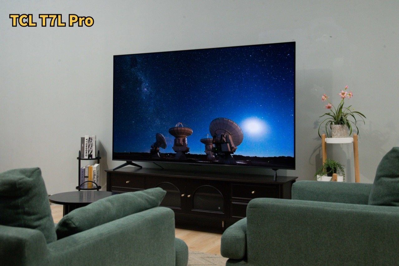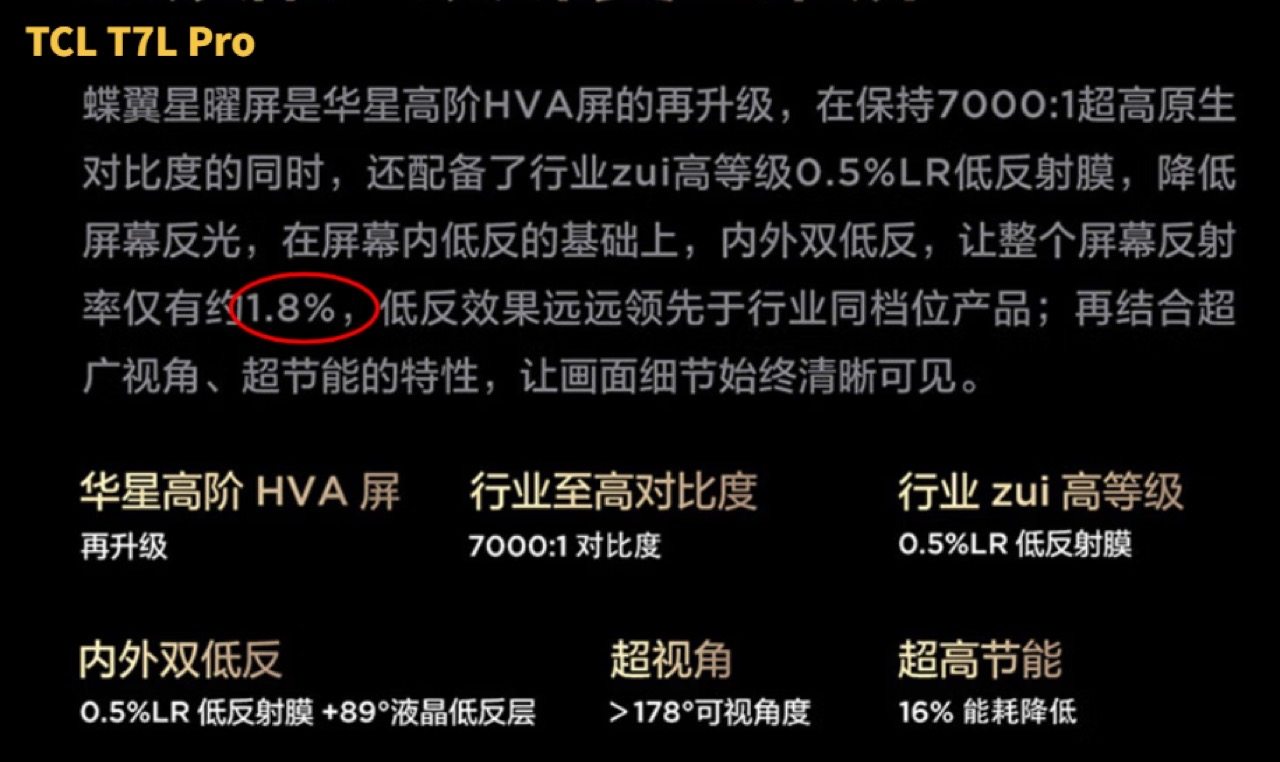 TCL T7L Pro在这方面给足了诚意,它采用的是和自家高端Q10系列同款的华星高阶HVA屏,原生对比度高达7000:1,属于目前行业的天花板水平。更难得的是,全系列都做到了1.8%的超低整机反射率——靠的是0.5%LR低反射膜叠加89°规则排列液晶分子,形成了内外双低反,真正兼顾了白天和夜晚的观看体验。