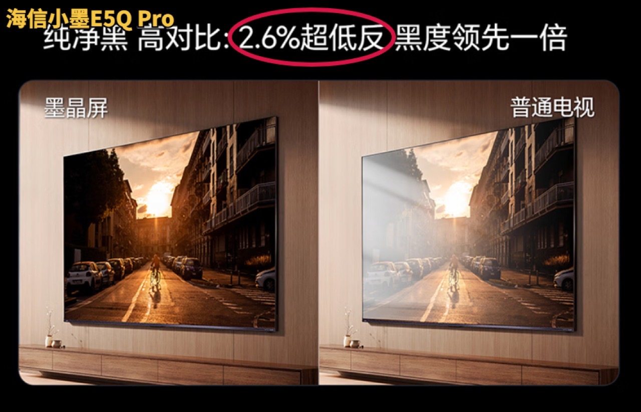 反观海信小墨E5Q Pro,屏幕配置比较复杂。只有100吋版用上了黑曜屏Pro,能做到1.8%反射率;其他尺寸则是墨晶屏或柔光防眩屏,反射率大约在2.6%左右。对比下来,不仅反射率略高,而且采用的是高端IPS屏,原生对比度约5000:1,相比TCL的7000:1,还是有一定差距的。简单来说,T7L Pro在屏幕这块,全系列都是一碗水端平的高规格,用得也更安心。