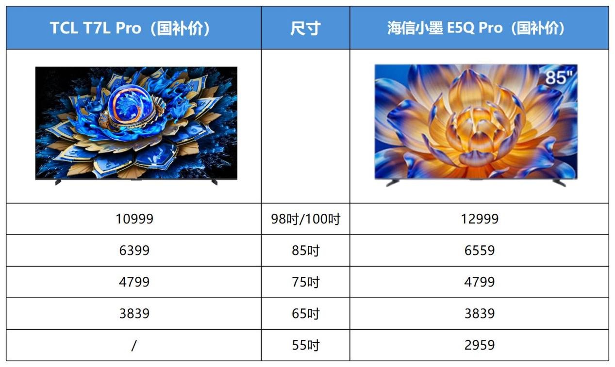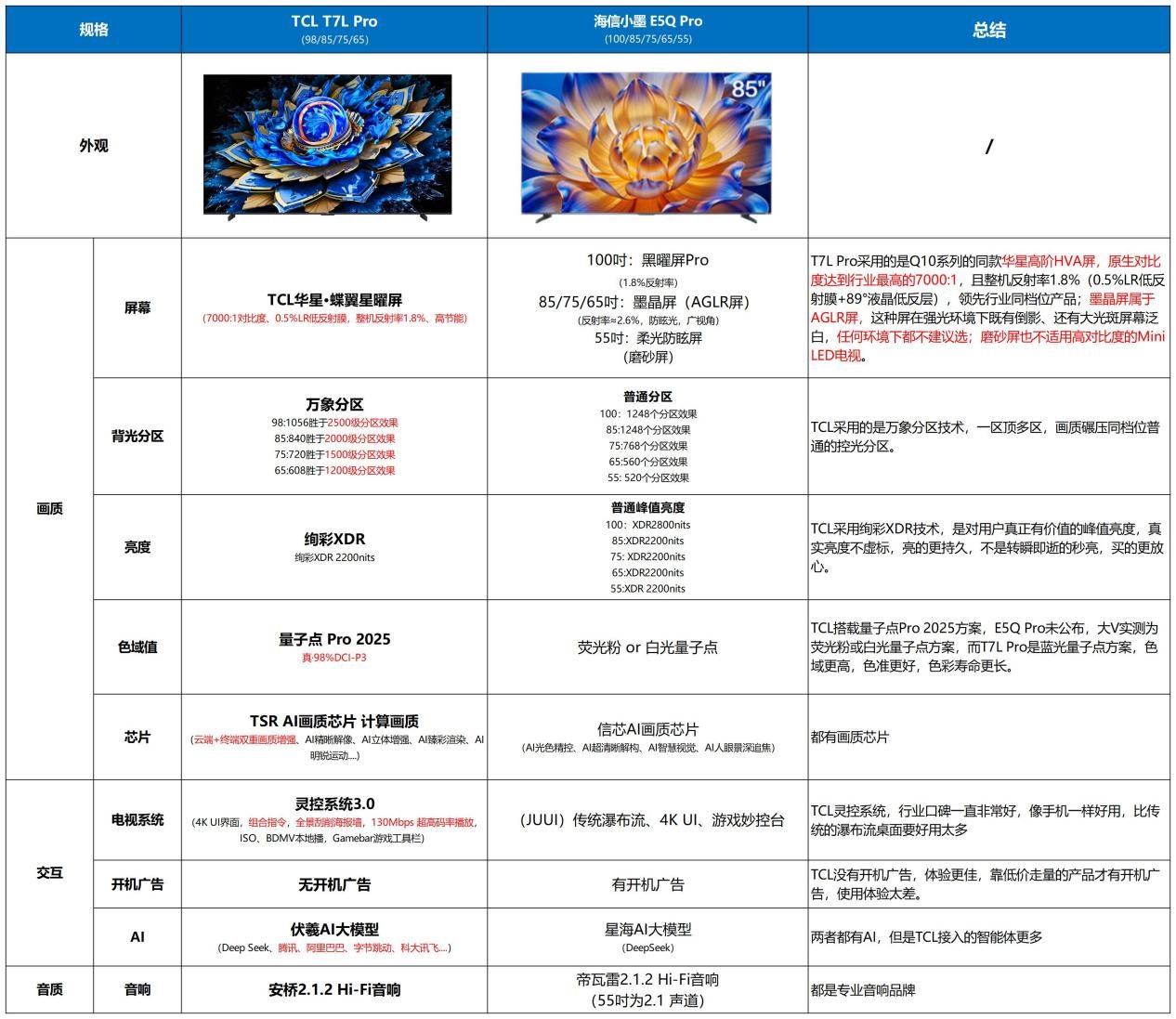 为了方便大家评估,我这里也整理了下两款机型在画质、交互以及音质上的具体配置,总的来说,这两款在该价位段都是不错的选择,但个人会更推荐TCL T7L Pro这款,尤其是对音画要求比较高的影视爱好者,这款确实非常能打,如果有换新需求的朋友可以不用得到618,上新价叠加国补,现在入手就非常香,感兴趣的可以去了解看看。