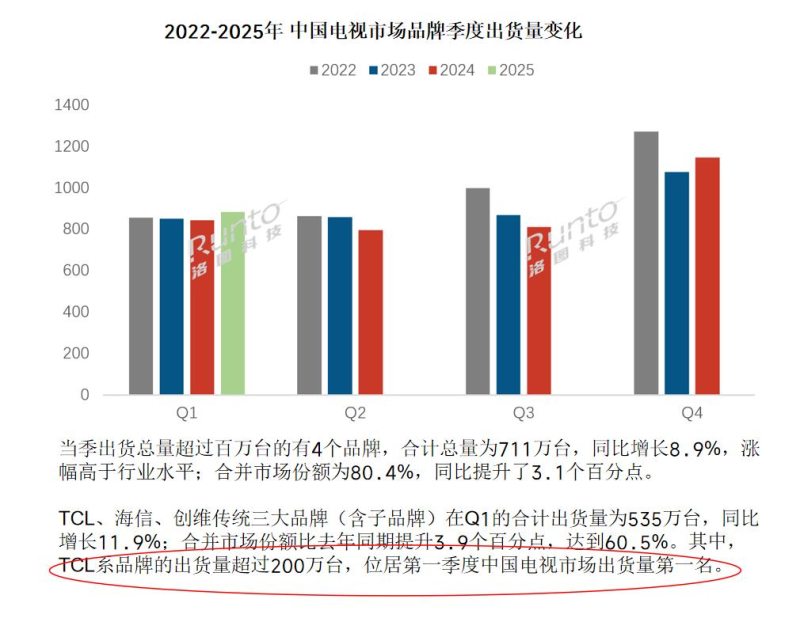 近日,洛图科技(RUNTO)发布的《中国电视市场品牌出货月度追踪》数据显示,2025年第一季度,中国电视市场整体出货量达到884万台,同比增长4.7%。其中,TCL系品牌以超过200万台的出货成绩稳居第一,展现出强大的市场引领力。