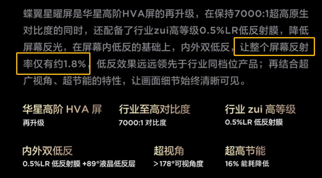 作为占据了电视50%以上成本的“灵魂部件”,屏幕的对比度直接关联了电视的画质。从目前市面上的主流屏幕来看,HVA旗舰屏(7000:1)>VA屏(5000:1)>IPS屏(1200:1),因此,追求好画质优先选HVA旗舰屏,高对比度的屏幕不仅可以让画面细节更加丰富,色彩更有层次感,并且也能减少漏光和光晕问题,因此,非常重要!