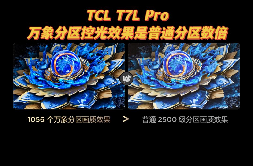 打个比方,从参数来看,TCL虽说只有1056个分区,但用的则是“一区顶多区”的万象分区技术,要知道,TCL通过背光到成像的全链路7大关键环节技术升级,让万象分区的控光效果达到了普通分区的数倍,也就是说,T7L Pro实际上可以呈现赶超2500级普通分区的画质效果,没有了光晕烦恼,画质清晰度和层次感拉满!