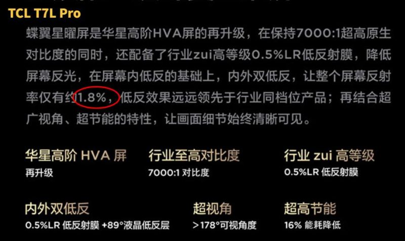 TCL T7L Pro用的蝶翼星曜屏是与自家高端Q10系列同源的华星高阶HVA屏,原生对比度高达7000:1,堪称行业顶尖!同时它全系列通过0.5%低反膜+规则排列液晶层实现内外双低反,实现整机反射率仅1.8%,不论白天强光还是夜间灯光,都能稳稳保障画质~
