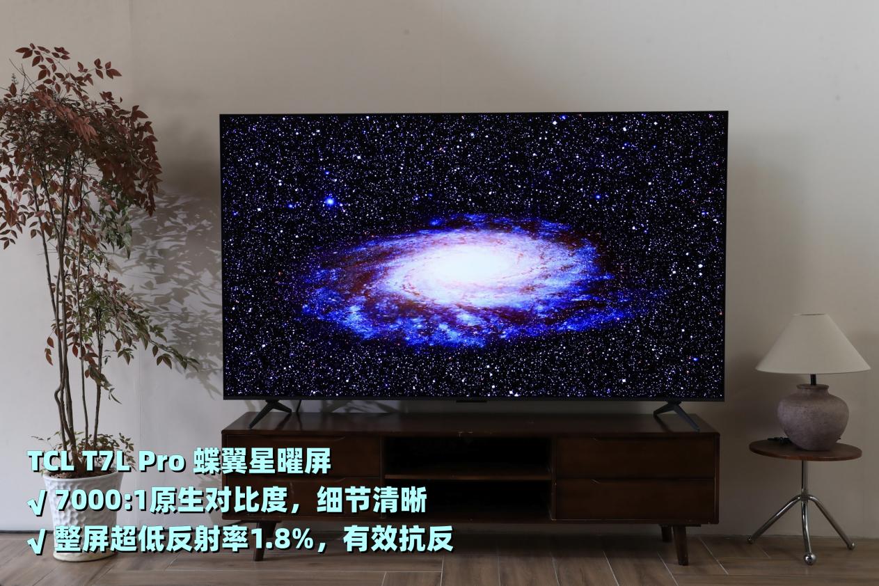 以TCL T7L Pro为例,全尺寸搭载的蝶翼星曜屏,不仅拥有 7000:1原生对比度,是普通IPS屏的5倍以上,暗场细节表现出色,而且还通过0.5%LR低反膜以及89°液晶分子规则排布,实现了整屏反射率1.8%,抗反表现优秀,个人更推荐。
