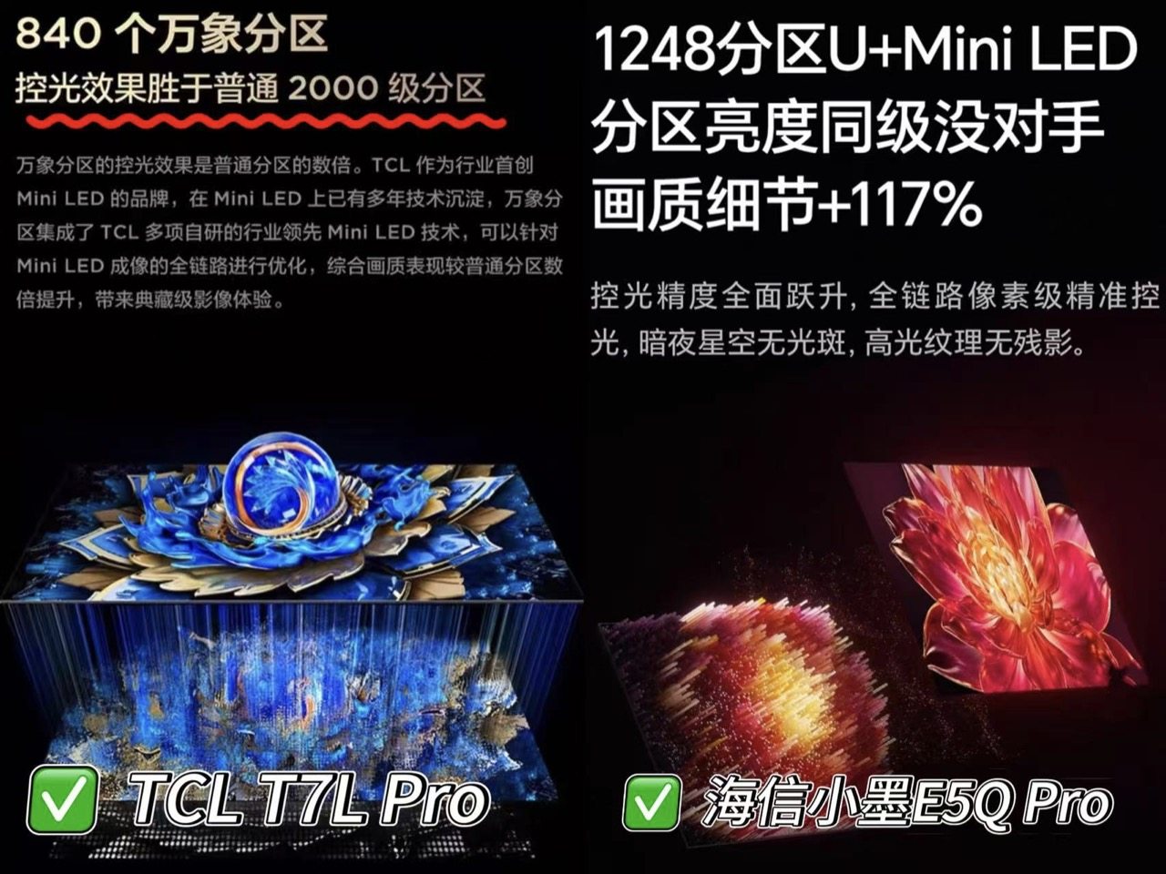 除屏幕外,背光分区也是影响画面质量的关键因素。很多人认为背光参数越高画质越好,实则不然。随着参数提升,对控光技术的要求也更高,缺乏技术支撑的话,容易出现光晕、画面模糊等问题。TCL T7L Pro 搭载万象分区技术,通过发光芯片、透镜技术、OD 设计等七大底层技术升级优化,实现 “一区顶多区” 的控光效果,所以T7L Pro的万象分区控光效果要略胜一筹。