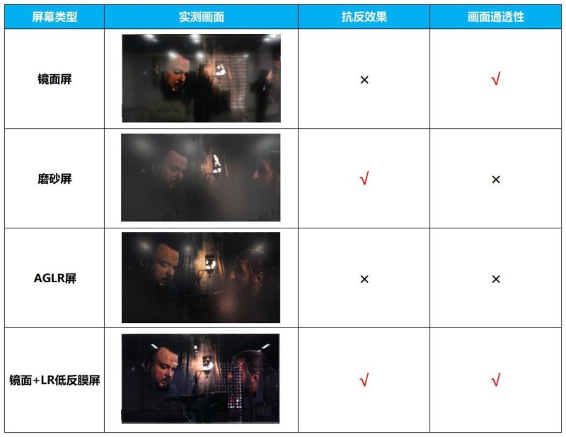 再来,屏幕的抗反效果也是画面体验好坏的关键。然而千万不能只考虑抗反效果,还得兼顾画面的通透性,否则屏幕抗反再好也是看了个寂寞,为了让大家更好地理解,我简单整理了下目前市面上主流的集中屏幕类型,可以看到,无论是镜面屏、磨砂屏亦或是AGLR屏,都没办法兼顾抗反和画面通透不泛白这两点。当然也有例外,比如TCL T7L Pro的这块蝶翼星曜屏就选择了采用镜面屏+LR低反膜的方案。