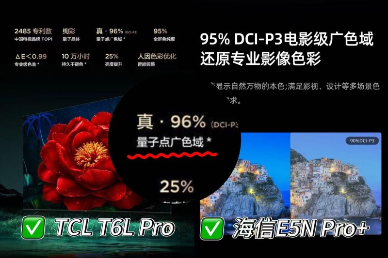 接下来,咱们就拿近期市场关注点比较高的TCL T6L Pro和海信 E5N Pro+这两款机型,从屏幕素质、控光技术、色彩亮度这三大核心维度展开对比,看看哪款才是2025年更值得入手的电视。