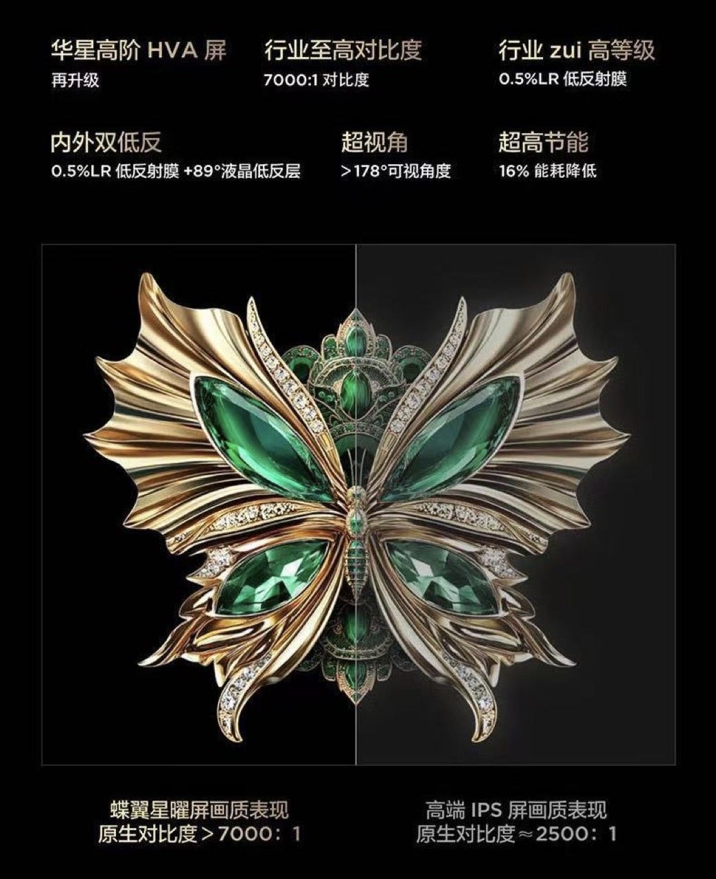 在 Mini LED 电视的核心性能指标——对比度与亮度方面,屏幕起着决定性作用。TCL T6L Pro 搭载了 TCL 自主研发的华星高阶 HVA 屏再升级版蝶翼星曜屏,原生对比度达到7000:1,远超传统 IPS 硬屏1200:1的对比度,即便经过改良的高端 IPS 硬屏,原生对比度也只能达到 2500:1。该屏幕能让画面黑得下去,亮得起来,充分发挥对比度的优势,使画面细节纤毫毕现。