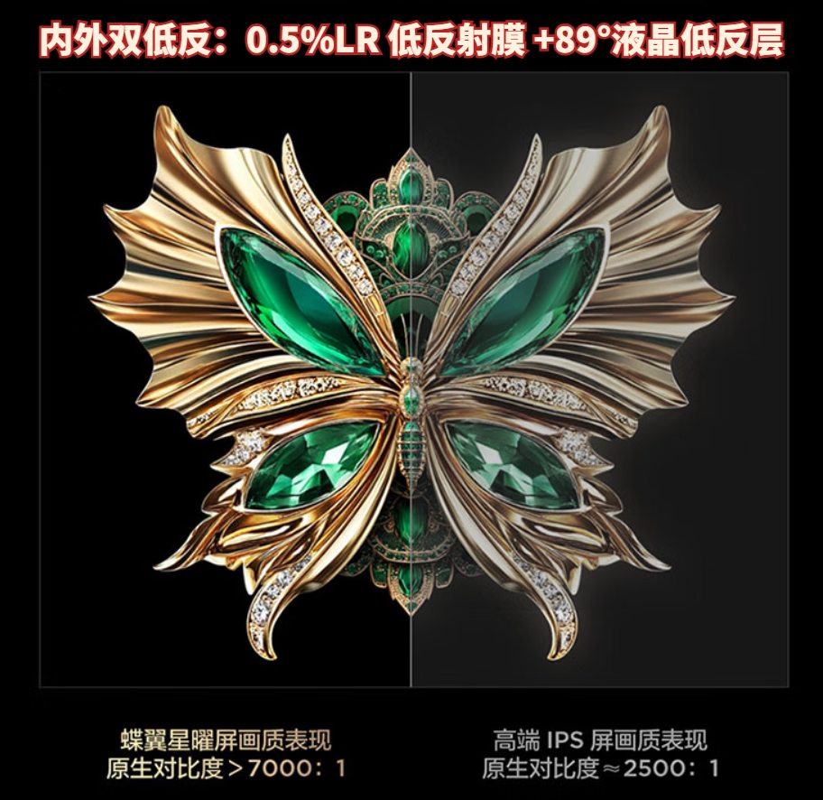 此次T6L Pro所搭载的蝶翼星曜屏,是去年TCL最高端旗舰机型才用得上的高端低反屏,由TCL旗下面板厂TCL华星研发制造,采用高阶HVA屏幕技术,原生对比度高达7000:1;0.5%LR低反膜结合89°规则排列液晶分子,使整屏反射率低至1.8%,将反射率控制得远低于行业普遍水平。即便在环境光复杂的观影环境下,画面依旧保持足够的纯净与对比,不易泛白、模糊,最大限度还原内容本身的质感。