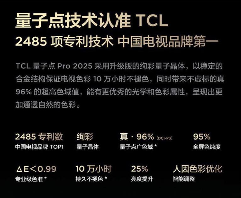 经过我的仔细分析,它俩还有一个巨大的“技术鸿沟”。TCL T6L Pro用的是自家最新的量子点Pro 2025技术,让它拥有了同级中几乎最为奢华的96% P3色域、95%全屏色纯度、10万小时不褪色的超长使用寿命、△E<0.99专业色准,直接对标专业级的设计师显示器。