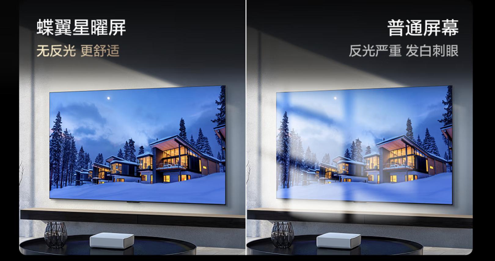 TCL Q9L Pro使用的屏幕是去年旗舰产品Q10K身上同款的蝶翼星曜屏,这块屏幕不仅内部有89°规则排布的液晶分子,可以提升屏幕的抗光能力,还有一层 0.5%LR的低反膜,在两者的共同作用下,整机的反射率低至1.8%,再加上它高达7000:1的超高对比度,无论白天黑夜,Q9L Pro都不会受到环境强光的干扰,可以提供更纯净、更清晰的画面,这个表现远超出同价位的其他品牌机型。