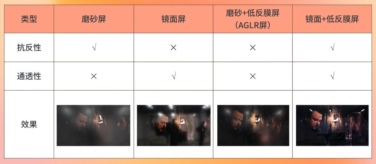 镜面屏:通透感强,画面亮丽清晰,但很容易受到环境光的干扰。