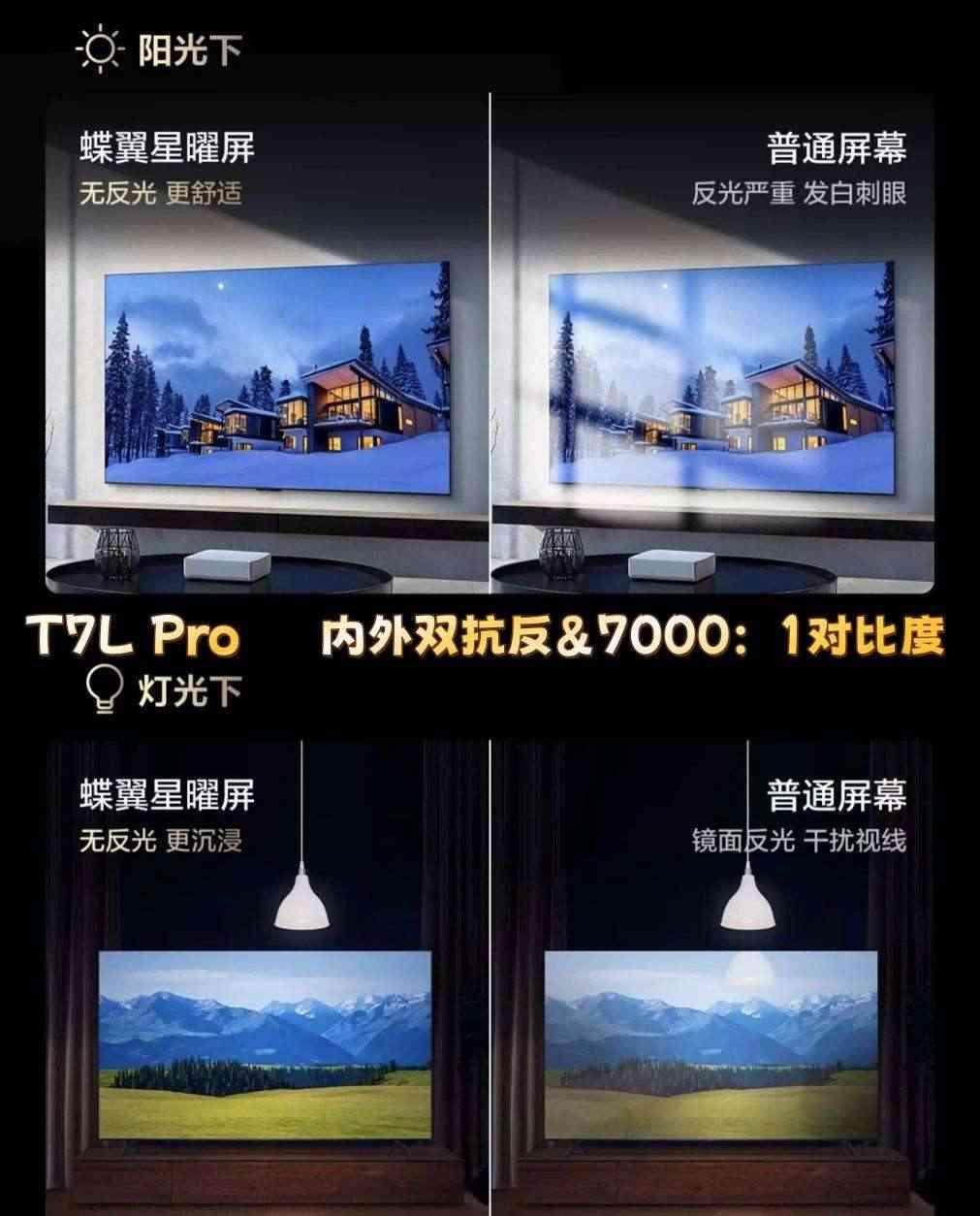 站在客厅C位的电视,首先得扛得住环境光的考验。在这一块,TCL T7L Pro全系列的蝶翼星曜屏,展现出了它大师级的抗光能力,整机低至1.8%反射率的背后黑科技不少,首先是表层0.5%LR低反射膜,再加上内部89°液晶分子层,无论从哪个角度射入的光线,都很难影响到画面,除此之外蝶翼星曜屏还带来了7000:1的超高对比度,在这两项技术的相辅相成之下,确保了T7L Pro可以提供清晰、透亮的画面。