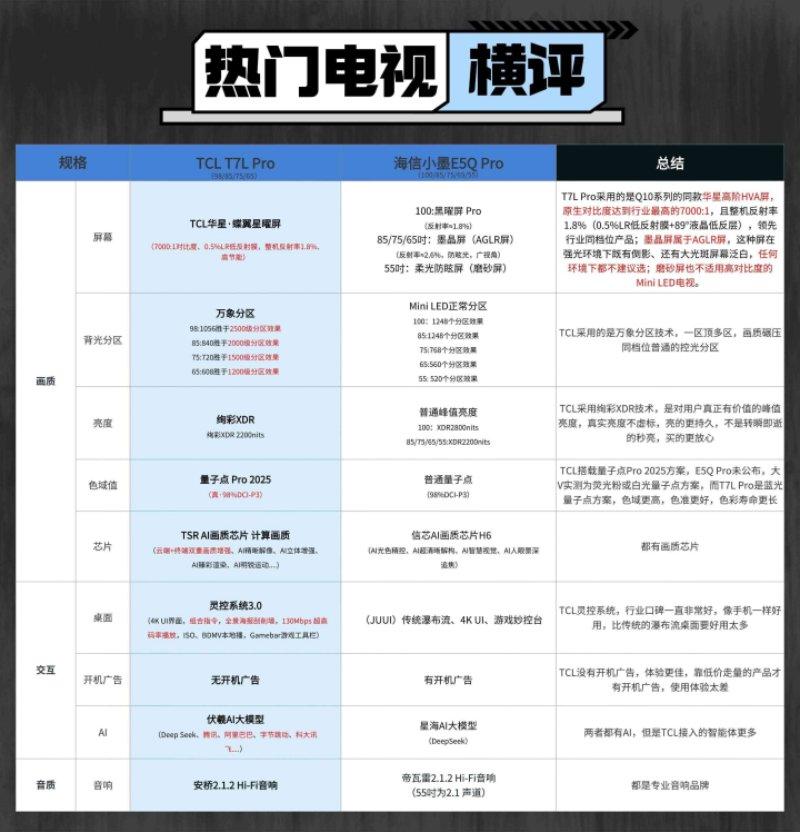 朋友,想象一下这个场景:夏天炎热周末的下午,你开着空调,抱着爆米花,瘫在沙发上,打算用电视刷部大片享受惬意时光,结果电影一开始,电视画面泛白就不说了,画面暗部细节还糊成一团,你不免发出感叹:“这都2025年了,想看大片只能去电影院吗?”哎,你还真别说,你缺的可能还真的只是一台新电视,今天咱们就拎出2025年两大热门选手,分别是TCL T7L Pro和海信小墨E5Q Pro,用较真的方式告诉你:买电视别头晕,注意这些细节百分百不会错!