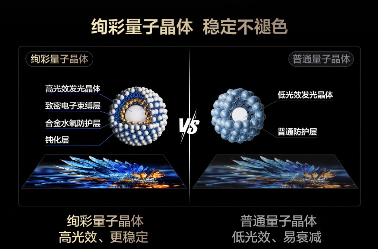 在2025年,TCL再度推出全新一代量子点Pro 2025技术,采用行业领先的绚彩量子晶体,结合复合纳米金刚结构,实现真96%PCI-P3超高色域值,全屏色纯度提升 95%,色准 ΔE<0.99,色彩表现更加精准、丰富和自然。无论是HDR内容的层次还原,还是高帧率画面的精准传递,量子点Pro 2025都为高品质显示奠定坚实基础。