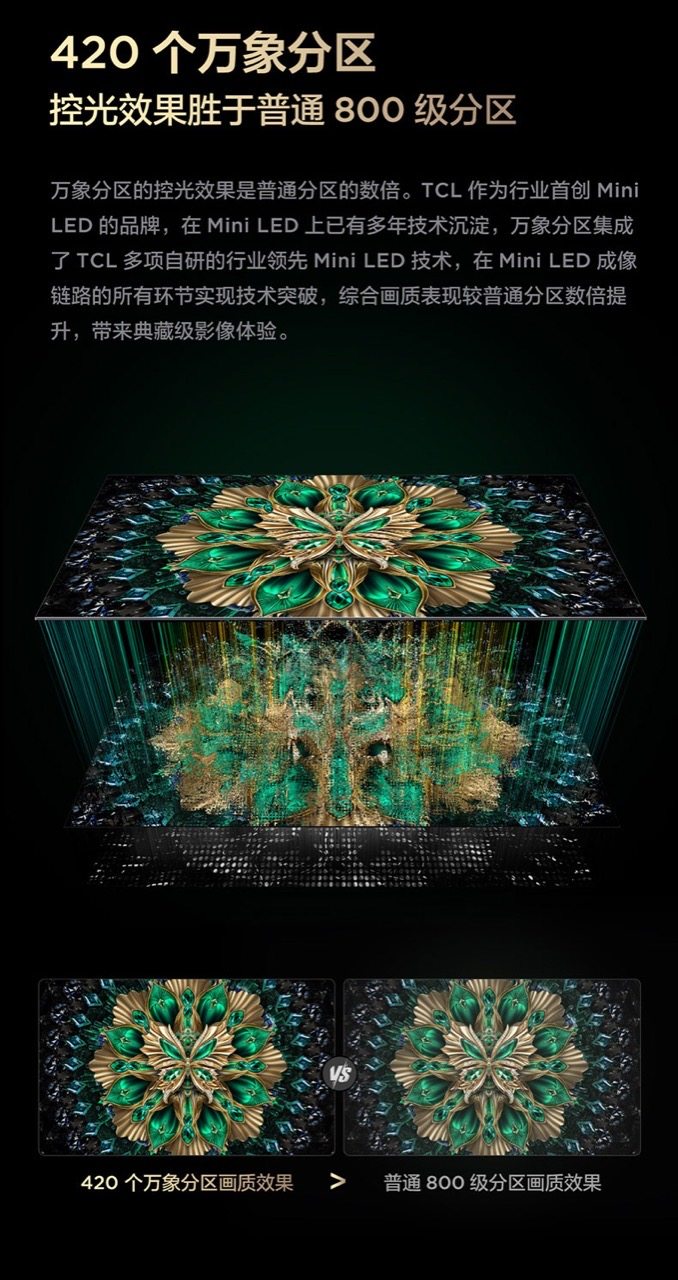 而TCL T6L Pro就搭载了万象分区技术,例如T6L Pro最多搭载420个万象分区,实际效果吊打800普通分区,再也不用担心光晕刺客,画质更上一层楼。