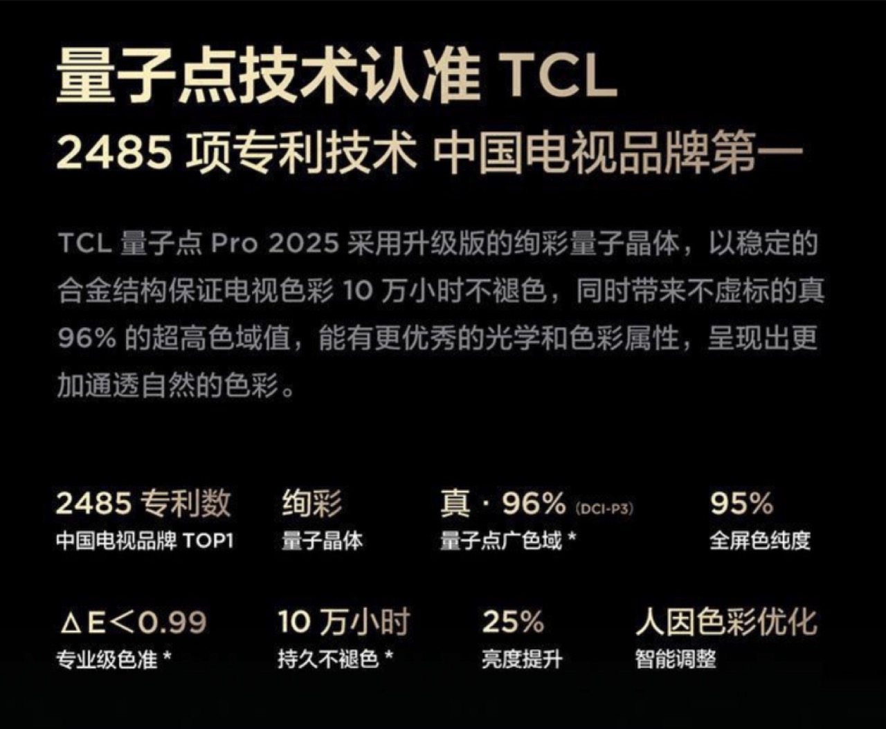 别被商家「高色域」的话术带沟里!色彩技术是关乎画质呈现的核心要素,但不能光看色域数值,还得看色彩算法,不然买回去的电视可能要辣眼睛了。这里大家只要记住,目前量子点技术是多数高端Mini LED产品的标配即可!例如TCL T6L Pro搭载的量子点Pro 2025技术,全面升级材料和色彩算法,拥有真96% DCI-P3超高色域值,色彩长达10万小时不褪色。