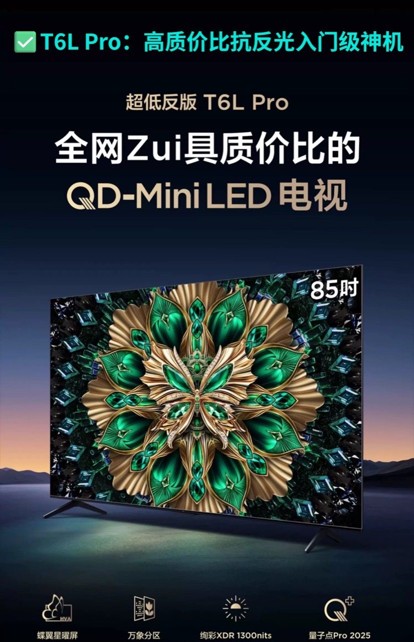 如果你是首次接触Mini LED电视,追求高质价比,那T6L Pro绝对是不二之选。它的抗反光和暗场细节可以说是做到了极致,并且国补后3000不到就能入手,这个价位能拥有低反屏,也就TCL拥有自有屏厂TCL华星才有这个底气!别家还真没有这么舍得的。做到了仅1.8%的整屏反射率,配合高达7000:1的原生对比度,以及万象分区高效控光,暗处细节分毫毕现,像在环境光复杂的客厅看电视基本没啥影响,普通电视在这方面简直望尘莫及啊~