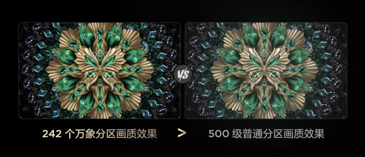 而让我下定决心入手的,还有它把旗舰电视才有的控光和色彩技术也都加进来了。比如T6L Pro的控光系统就不是那种简单的“多少分区”数字游戏,而是TCL独家的万象分区,这可不是单纯多堆几个灯珠,而是从芯片、透镜、响应速度、算法等等一整套体系去优化的。比方说65吋T6L Pro用了242个万象分区,但远超500级普通分区的控光效果,不管是亮场高光还是暗场控黑,看起来更自然、更有层次感。