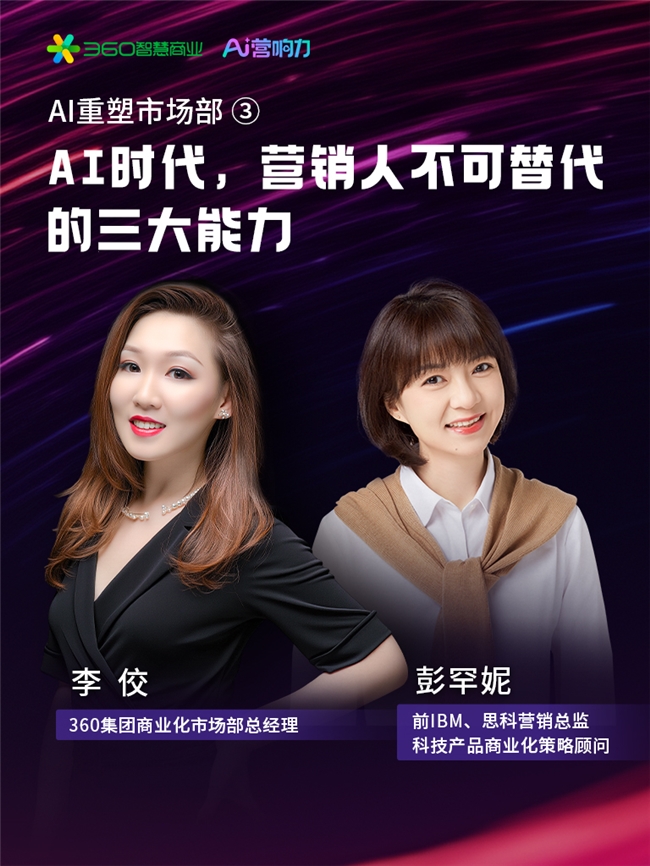 秉持“真话真相真功夫”的宗旨,为帮助营销人缓解工作焦虑,应对行业冲击,5月19日,360智慧商业直播轻分享栏目《AI营响力》邀请到前IBM、思科营销总监,科技产品商业化策略顾问彭罕妮,以《AI时代,营销人不可替代的三大能力》为主题,与360集团商业化市场部总经理李佼,共同探讨了新时期市场部的核心价值、营销人的保值能力,和如何实现职业进阶。