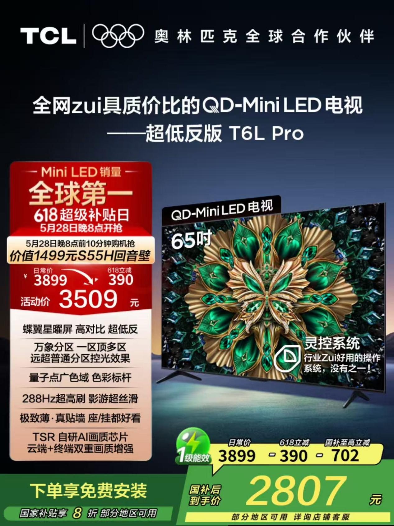 各位可以根据自身需求选择,T6L Pro国补后还有618叠加优化,比之前买还便宜了几百,65吋2807元即可拿下,妥妥的最具质价比的抗反光Mini LED电视,早买早享受。