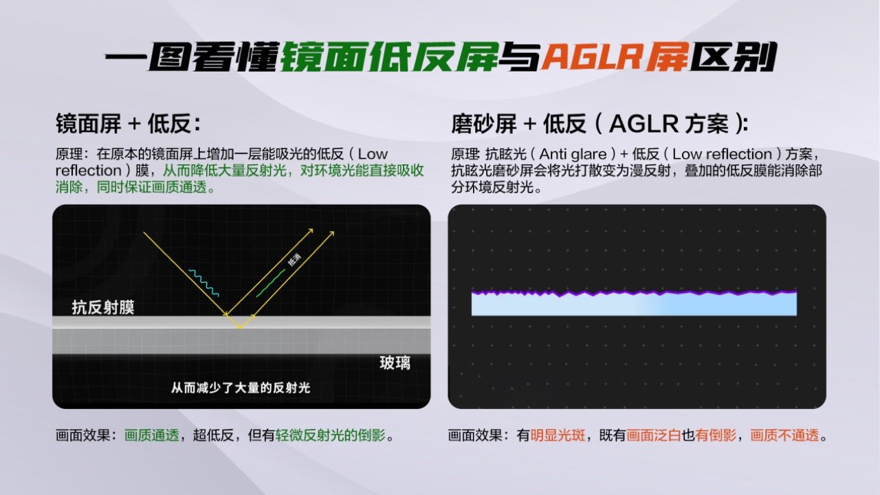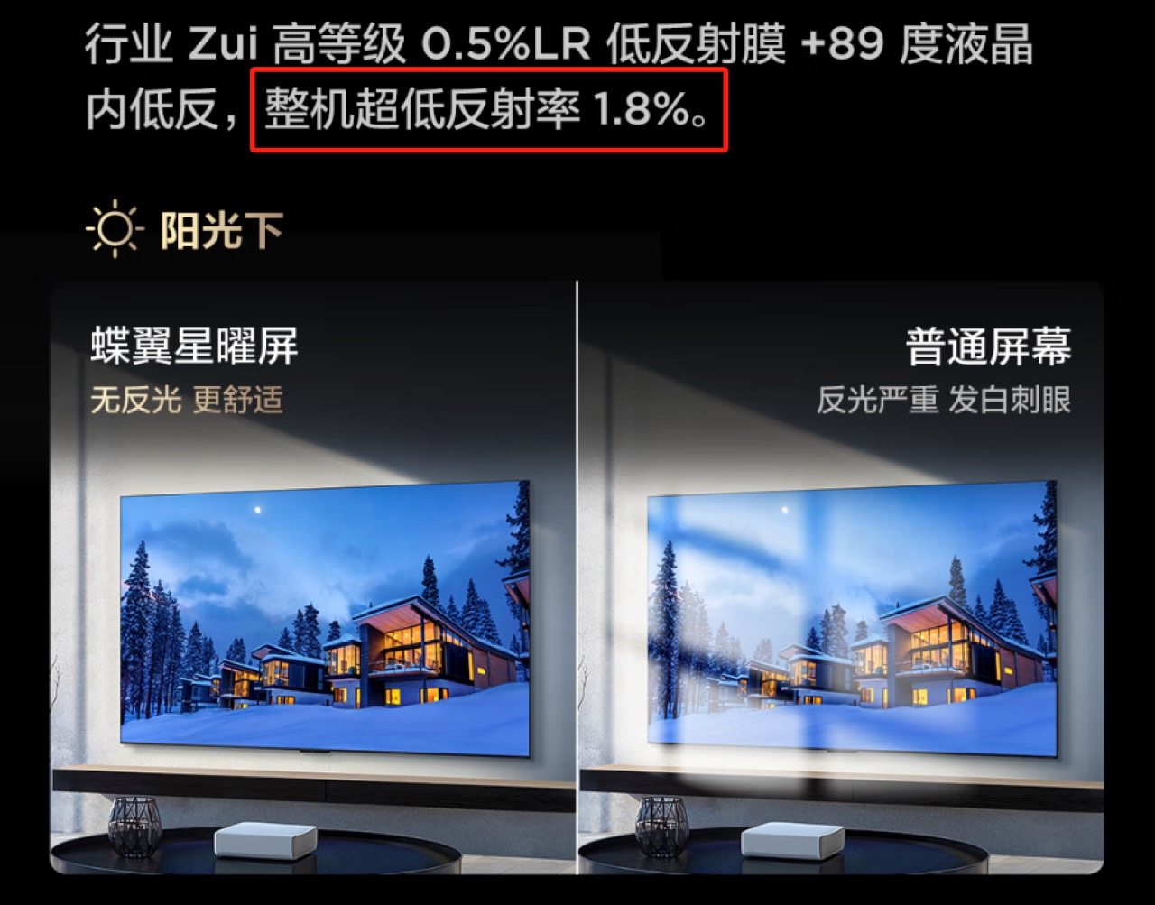 要细说这背后的技术就会发现,确实大有门道。首先这块蝶翼星曜屏采用的是镜面+低反膜的方案,而这也是目前市面上的主流抗反方案,三星这类的高端电视都以这种技术为主,而另外一种便是磨砂+低反膜方案,也就是我们常听的AGLR屏,有一定的抗反效果,但遇到大面积光情况下会有光斑,画面会泛白,清晰度有所下降,画质党不太建议。